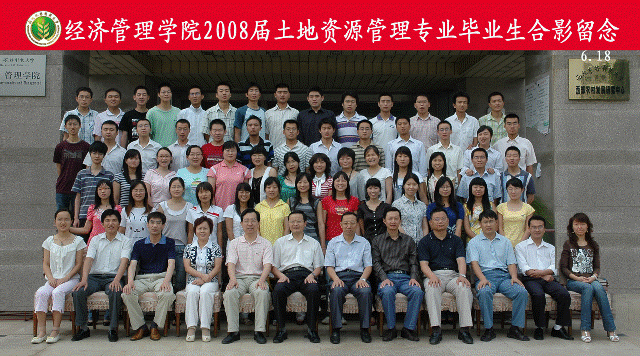 前排从左到右依次为:辅导员郭晓勇、辅导员王家武、系主任吕德宏、副院长温晓林、院党委副书记聂海、副院长李录堂、 院党委书记罗剑朝、院长霍学喜、副院长孟全省、副院长姚顺波、班主任曲云峰、班主任牛荣